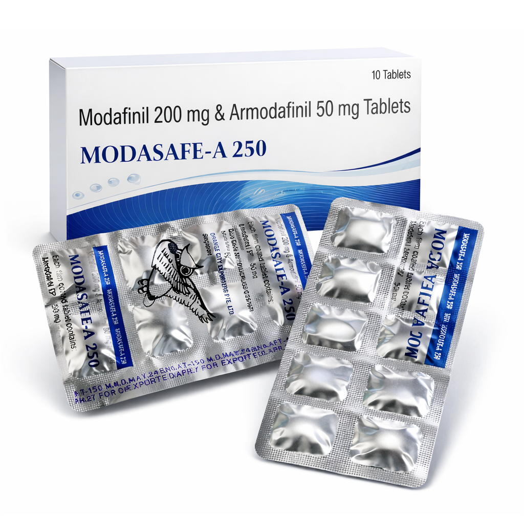 Chcete pracovat aktivněji a efektivněji během denní pracovní doby? Modasafe 250 je nejlepší lék, který zvyšuje bdělost a podporuje bdělost. Modasafe 250 obsahuje Modafinil 200 mg a Armodafinil 50 mg, které působí společně na léčbu nadměrné denní ospalosti zvané narkolepsie, která se vyznačuje nadměrnou denní ospalostí a krátkými mimovolnými spánkovými epizodami. Používá se před pracovní dobou během dne. Stimuluje CNS, což způsobuje individuální upozornění při práci.